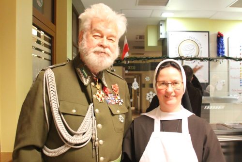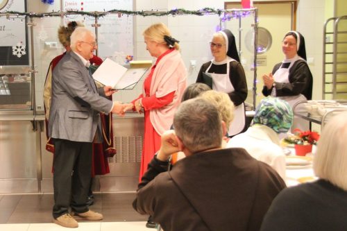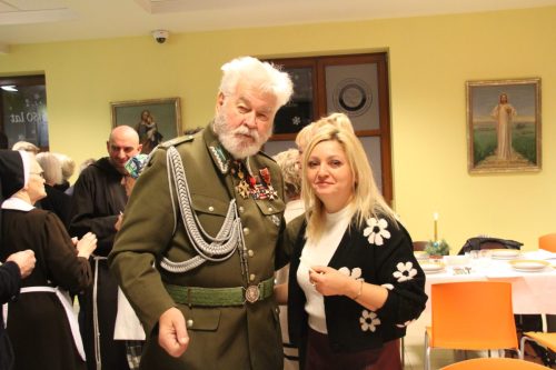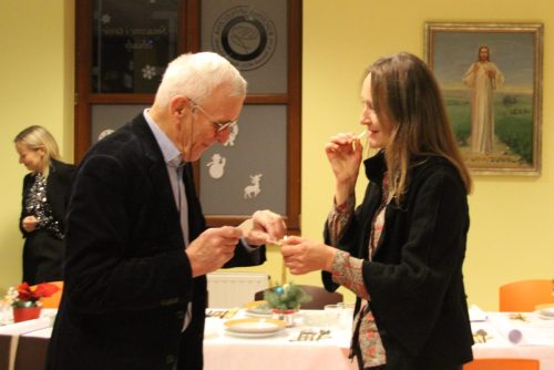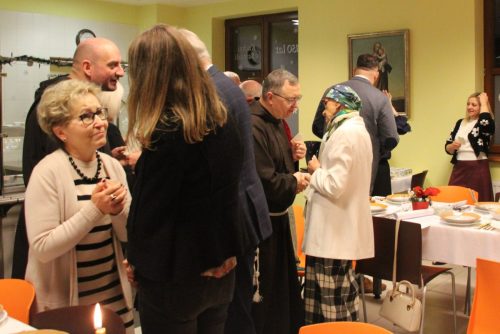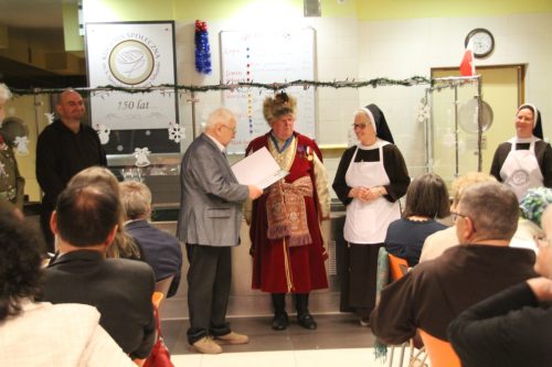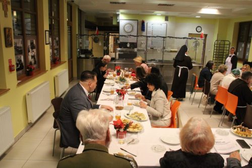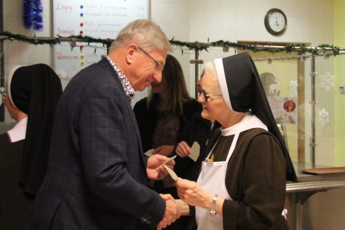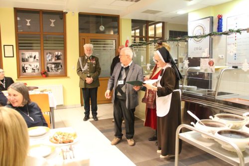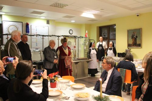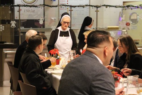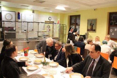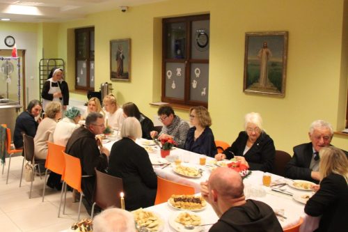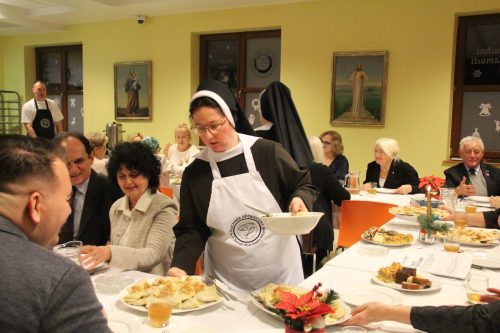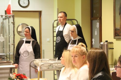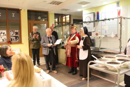 Zgodnie z tradycją był barszczyk z uszkami, smażona ryba, pierogi i pyszny makowiec – dania wigilijne, wszystko to przygotował zespól Kuchni Społecznej im. s. Samueli prowadzonej obecnie przez s. Bernadettę. Potrawy wigilijne oraz wspólne kolędowanie wprowadziły wszystkich w atmosferę świąt. Śpiewano kolędy przy akompaniamencie Andrzeja Knapika – barda klubu muzycznego „Klub Buda”.